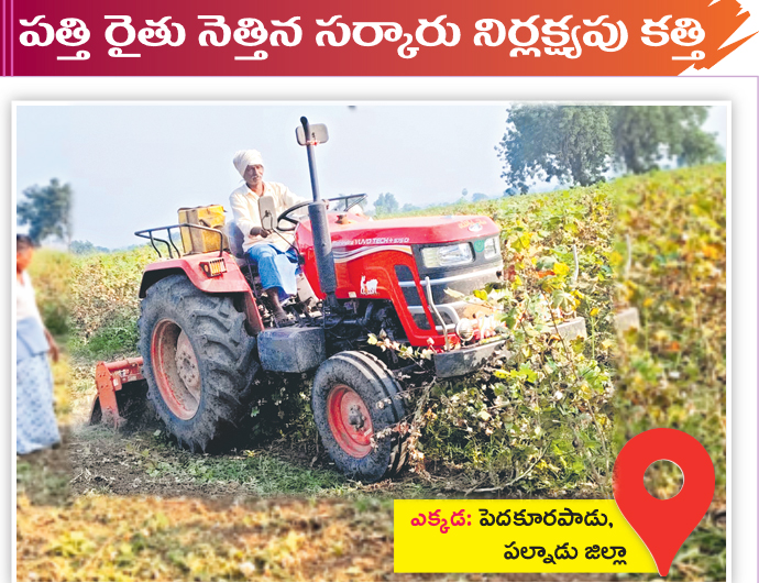 పత్తికి ధర లేకపోవడంతో పల్నాడు జిల్లా పెదకూరపాడులో పత్తిపంటను దున్నేస్తున్న రైతు మాబు(ఫైల్)