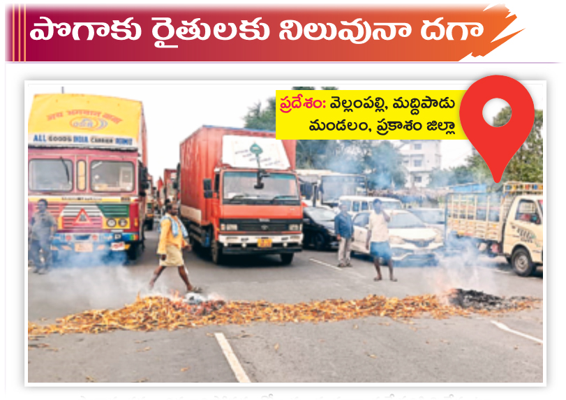 పొగాకు ధరలు దిగజారిపోవడంతో ఖర్చులకు కూడా వచ్చే పరిస్థితి లేదంటూ జూన్ 26వ తేదీన ప్రకాశం జిల్లా మద్దిపాడు మండలం వెల్లంపల్లి వద్ద జాతీయ రహదారిపై పొగాకును తగలబెట్టి, నిరసన వ్యక్తం చేస్తున్న రైతులు (ఫైల్)