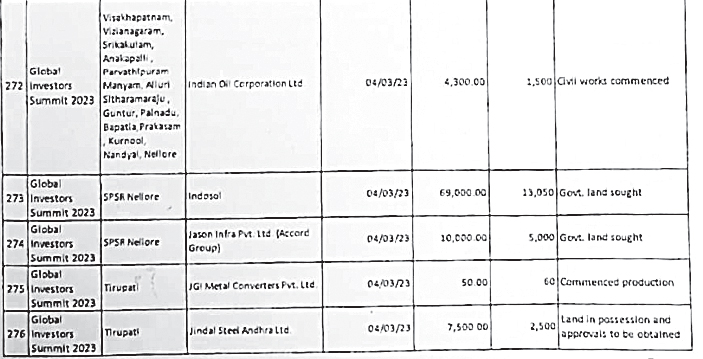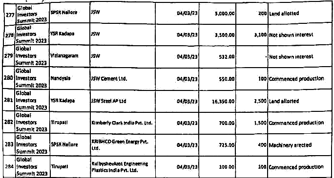 గత ప్రభుత్వం 2023లో కుదుర్చుకున్న ఒప్పందాలలో 91 శాతం వాస్తవరూపం దాల్చినట్టుగా పరిశ్రమల శాఖ అధికారులు లిఖితపూర్వకంగా ఇచ్చిన సమాధానం