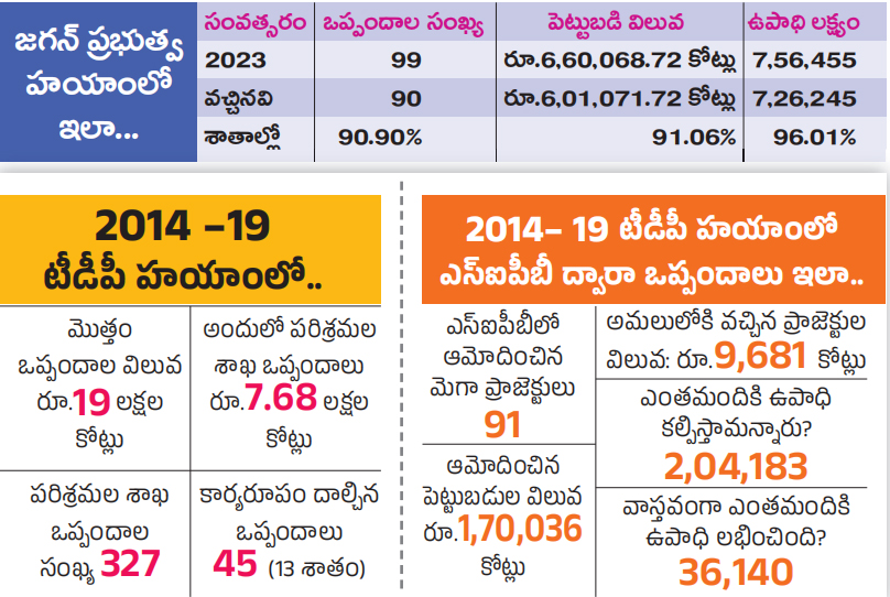 అందులో మొత్తం రూ.1,70,036 కోట్ల విలువైన 91 మెగా ప్రాజెక్టులకు ఆమోదం తెలిపారు. వీటి ద్వారా 2,04,183 మందికి ఉపాధి లభిస్తుందని ప్రకటించారు. అయితే నాడు టీడీపీ ప్రభుత్వం గద్దె దిగిపోయే నాటికి ఎస్ఐపీబీ సమావేశాల్లో ఆమోదం పొందిన వాటిలో 5.69 శాతం మాత్రమే అమల్లోకి వచ్చాయి. రూ.9,681 కోట్ల విలువైన ఒప్పందాలు మాత్రమే వాస్తవ రూపంలోకి వచ్చాయి. వీటి ద్వారా ఉపాధి లభించింది 36,140 మందికి మాత్రమే.