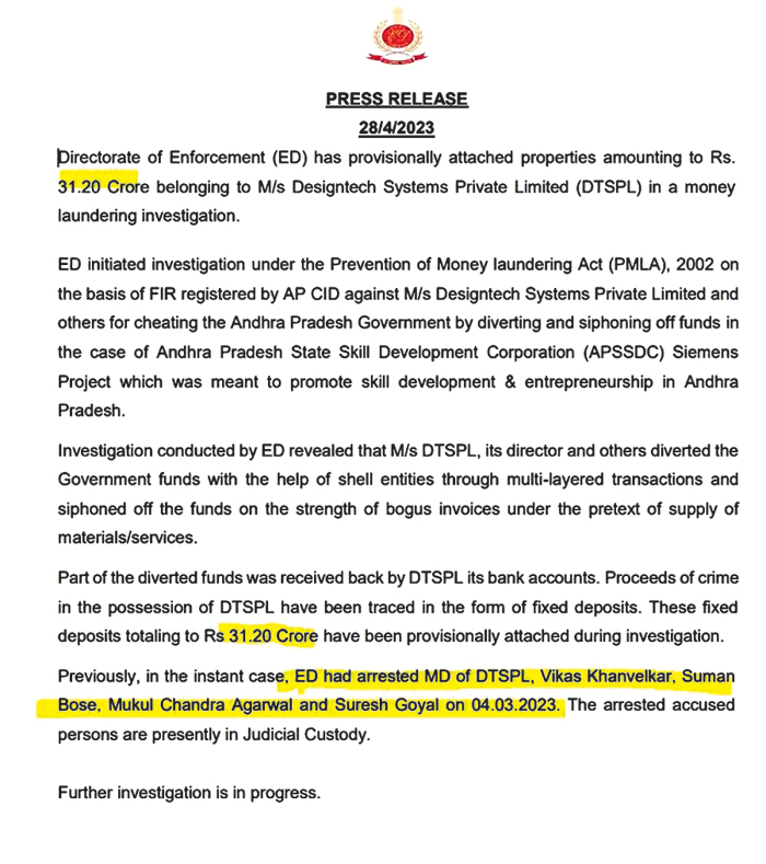 ఇక అప్పటి ప్రభుత్వ ప్రధాన కార్యదర్శి ఐవైఆర్ కృష్ణారావు, ఆర్థిక శాఖ కార్యదర్శి పీవీ రమేశ్, ప్రత్యేక కార్యదర్శి సునీత అభ్యంతరాలను బేఖాతరు చేస్తూ చంద్రబాబు ప్రభుత్వం తన వాటా కింద జీఎస్టీ కలిపి డిజైన్ టెక్ కంపెనీకి రూ.371 కోట్లు విడుదల చేసింది. ఈ కుంభకోణానికి రాచబాట పరుస్తూ మొత్తం 13 నోట్ ఫైళ్లలో అప్పటి ముఖ్యమంత్రి చంద్రబాబు సంతకాలు కూడా చేశారు. డిజైన్ టెక్కు చెల్లించిన రూ.371 కోట్లలో సాఫ్ట్వేర్ కొనుగోలు కోసం రూ.56 కోట్లు చెల్లించారు. మిగతా రూ.315 కోట్లను షెల్ కంపెనీల ద్వారా బోగస్ ఇన్వాయిస్లు సమర్పించి వివిధ దశల్లో అక్రమంగా తరలించారు.