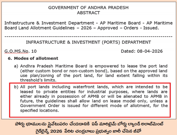 తూర్పు తీర ప్రాంతానికి ముఖద్వారంగా ఉన్న ఆంధ్రప్రదేశ్ తీరాన్ని దోచుకో.. పంచుకో.. తినుకో.. విధానంలో టీడీపీ పెద్దలకు కావాల్సిన వారికి కట్టబెట్టడానికి రంగం సిద్ధమైంది. సంపద సృష్టిలో భాగంగా వైఎస్ జగన్ ప్రభుత్వం పోర్టులు, ఫిషింగ్ హార్బర్లను నిర్మిస్తే.. చంద్రబాబు వాటిని ప్రైవేటుపరం చేస్తున్నారు. ఇప్పటికే జువ్వలదిన్నె ఫిషింగ్ హార్బర్ను ప్రైవేటుపరం చేస్తున్న చంద్రబాబు సర్కారు.. మిగిలిన పోర్టులు, హార్బర్లను కూడా ప్రైవేటు వ్యక్తులకు దోచిపెట్టనుంది. ఈ కుట్రలో భాగంగానే తీరప్రాంతం అభివృద్ధి ముసుగులో ఏపీ మారిటైమ్ బోర్డు ల్యాండ్ అలాట్మెంట్ గైడ్లైన్స్ 2026 తాజాగా విడుదల చేసింది. దీనిద్వారా తీర ప్రాంతంలోని వాటర్ ఫ్రంట్ ఏరియా, తీరం, ఉప్పు సాగు భూములను టీడీపీ పెద్దలు తమకు నచ్చినవారికి కేటాయించనున్నారు.