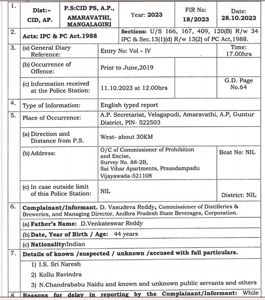 2023లో డిస్టిలరీస్ ఎండ్ బేవరేజస్ కార్పొరేషన్ కమిషనర్ డి.వాసుదేవరెడ్డి ఫిర్యాదు మేరకు చంద్రబాబు, కొల్లు రవీంద్ర, ఐఎస్ శ్రీనరేష్ తదితరులపై కేసు నమోదు సీఐడీ అధికారులు