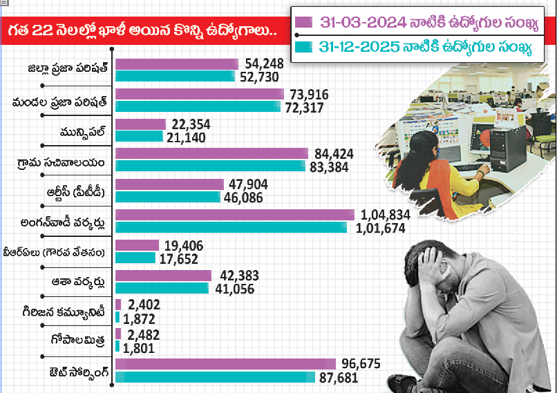 మరోవైపు 2025 డిసెంబర్ నాటికి (చంద్రబాబు ప్రభుత్వంలో) రాష్ట్ర ప్రభుత్వ ఉద్యోగుల సంఖ్య 10.07 లక్షలు మాత్రమేనని ద్రవ్య విధాన పత్రంలో తెలియచేయడం గమనార్హం. అంటే చంద్రబాబు పాలనలో ఉద్యోగుల సంఖ్య ఏకంగా 1.72 లక్షలు తగ్గిపోయినట్లు స్పష్టమవుతోంది. ఖాళీగా ఉన్న ఈ పోస్టులను భర్తీ చేయకుండా జాబ్ క్యాలెండర్ పేరుతో చంద్రబాబు సర్కారు కళ్లుగప్పుతోందని నిరుద్యోగులు మండిపడుతున్నారు.