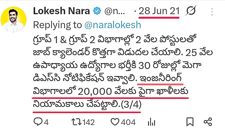 » ప్రభుత్వ శాఖల్లో వేలాది ఉద్యోగాలు ఖాళీగా ఉన్నా, గత ప్రభుత్వం భర్తీ చేయడం లేదని ప్రతిపక్షంలో చంద్రబాబు, ఆయన తనయుడు లోకేశ్ విమర్శించారు. గ్రూప్–1, 2 పోస్టులు 2 వేలు, ఇంజినీరింగ్ పోస్టులు 20 వేలు, టీచర్ పోస్టులు 25 వేల ఖాళీలు ఉన్నాయని ప్రచా రం చేశారు. కానీ ఇప్పుడు అతి స్వల్పంగానే పోస్టు లను ప్రకటించడం అనుమానాలకు తావిస్తోంది.