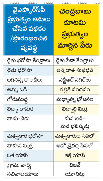 ఇప్పటికే అమ్మ ఒడి, రైతు భరోసా, నాడు–నేడు, దిశా యాప్, విద్యా కానుక పేర్ల మార్పు