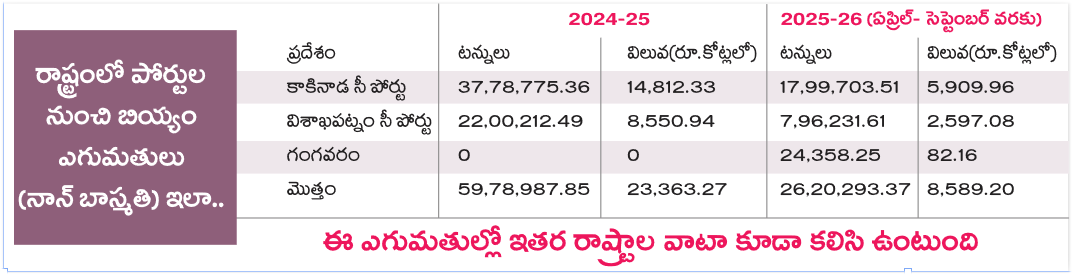 కూటమి ప్రభుత్వం వచ్చిన తర్వాత 2024–25 ఆర్థిక ఏడాదిలో రాష్ట్రంలోని పోర్టుల నుంచి ఏకంగా రూ.23,363 కోట్ల విలువైన 59.78 లక్షల టన్నుల బియ్యం ఎగుమతులు జరిగాయి. ఈ ఆర్థిక సంవత్సరం తొలి ఆరునెలల్లో (ఏప్రిల్–సెప్టెంబర్) రూ.8,500 కోట్ల విలువైన 25లక్షల టన్నుల నాన్బాస్మతి బియ్యం విదేశాలకు చేరింది. ఇక్కడ విచిత్రం ఏమంటే, ఈ దందా కాకినాడ పోర్టుతో పాటు విశాఖ పోర్టుకు పాకింది. ఈ బియ్యం మొత్తాన్ని ఆఫ్రికా దేశాలకు తరలించేశారు.