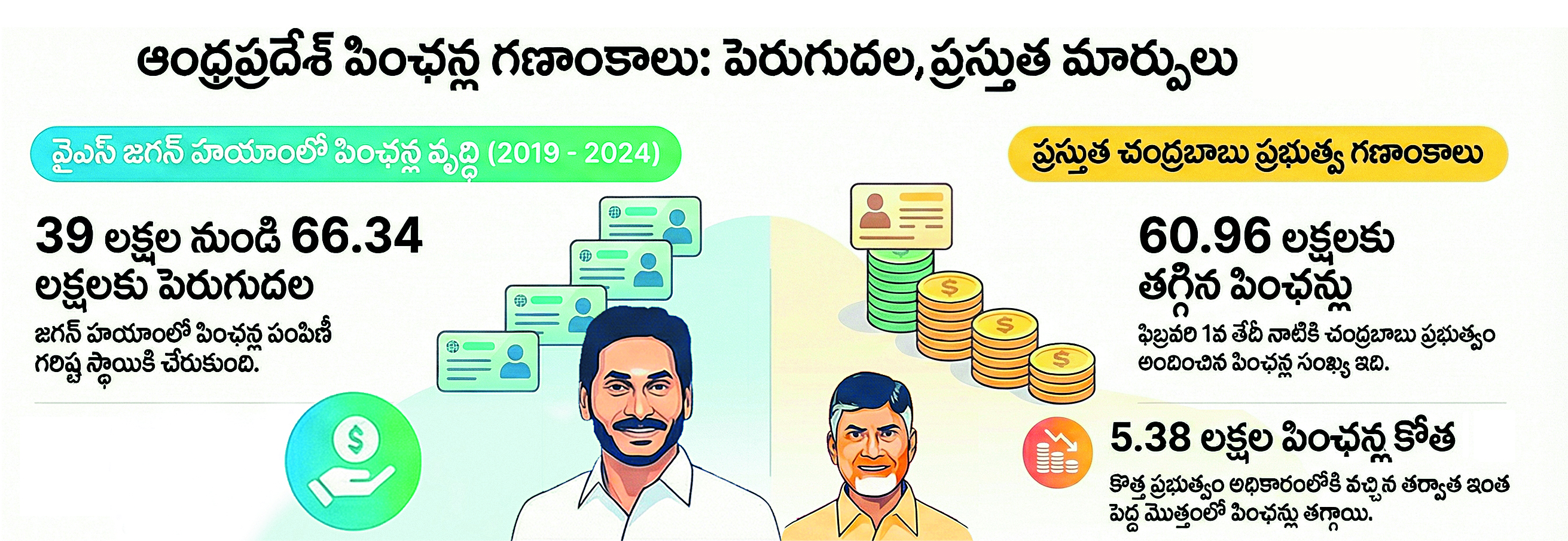 అర్హులకు ఎప్పటికప్పుడు పింఛన్లు మంజూరు చేశారు. దీంతో వైఎస్ జగన్ సీఎంగా ఉన్న ఐదేళ్లలో పింఛన్ లబ్ధిదారుల సంఖ్య 66.34 లక్షలకు పెరిగింది. 2024లో చంద్రబాబు కూటమి ప్రభుత్వం వచ్చినప్పటి నుంచి పింఛన్ల సంఖ్య తగ్గిపోయింది. ఈ నెల (ఫిబ్రవరి) 1న జరిగిన పింఛన్ల పంపిణీలో 60,96,108 మందికే ఇచ్చారు. చంద్రబాబు ప్రభుత్వంలో ఈ 20 నెలల్లో కొత్తగా ఒక్కరికి కూడా పింఛను ఇవ్వకపోగా, 5 లక్షలకు పైగా పింఛన్లు తగ్గిపోవడం గమనార్హం.