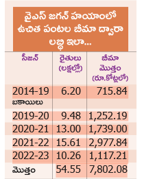 ప్రభుత్వ వాటాతోపాటు రైతుల తరఫున రూ.3,022.26 కోట్లను ప్రీమియం రూపంలో కంపెనీలకు చెల్లించింది. 2014–19 మధ్య చంద్రబాబు హయాంలో ఐదేళ్లలో 30.85 లక్షల మందికి రూ.3,411.20 కోట్ల మేర బీమా పరిహారం అందిస్తే 2019–24 మధ్యలో వైఎస్ జగన్ హయాంలో 54.55 లక్షల మంది రైతులకు రూ.7,802.08 కోట్ల మేర పరిహారాన్ని అందజేయగా, వైపరీత్యాల వేళ పంటలు నష్టపోయిన 24.80 లక్షల మంది రైతులకు రూ.2,558.07 కోట్ల ఇన్పుట్ సబ్సిడీని అందజేసి అండగా నిలిచారు.