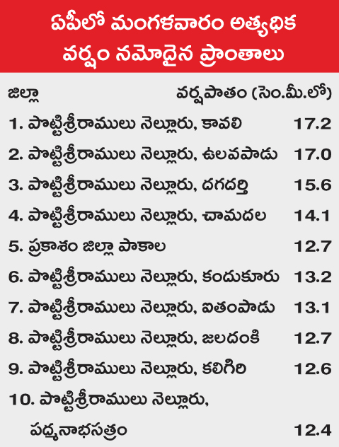 నెల్లూరు జిల్లా మనుబోలు మండలం గొట్లపాళానికి చెందిన కృష్ణమనేని జయమ్మ (65) గేదెలను మేపేందుకు వెళ్లి పొట్టేళ్ల కాలువలో గల్లంతయింది. ఈత గాళ్లను రంగంలోకి దించి గాలిస్తున్నారు. రాత్రి వరకు ఆమె జాడ తెలియరాలేదు. గుండ్లకమ్మ నది పోటెత్తడంతో ప్రకాశం జిల్లా కురిచేడు మండలం ముష్ట గంగవద్ద చప్టా కోతకు గురైంది. దీంతో పదుల సంఖ్యలో గ్రామాల మధ్య రాకపోకలు తెగిపోయాయి.