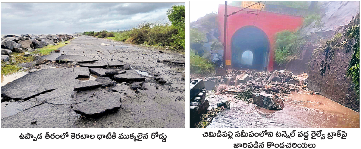 అల్లూరి జిల్లాలో గెడ్డలు, వాగులు పొంగి ప్రవహిస్తున్నాయి. కొత్తవలస–కిరండూల్ రైల్వే లైన్లో చిమిడిపల్లి సమీపంలోని టన్నెల్ వద్ద కొండచరియలు ట్రాక్పై జారి పడ్డాయి. వరదనీరు ట్రాక్పై పొంగి ప్రవహించింది. ట్రాక్పై బండరాళ్లు, మట్టి తొలగించే పనుల్లో రైల్వే వర్గాలు నిమగ్నమయ్యాయి. ఈ మార్గంలో సోమవారం రాత్రి నుంచి అన్ని రైళ్ల రాకపోకలను నిలిపివేయడంతో ప్రమాదం తప్పింది. అరకులోయ–అనంతగిరి ఘాట్లో సుంకరమెట్ట, బీసుపురం సమీప ప్రాంతాల్లో రోడ్డుపై వరదనీరు పొంగి ప్రవహించింది. ఘాట్ మార్గాల్లో రాత్రి పూట ప్రయాణాలను నిలిపివేశారు. బలిమెల జలాశయ నీటిమట్టం ప్రమాదకర స్థాయికి చేరుకుంది.
