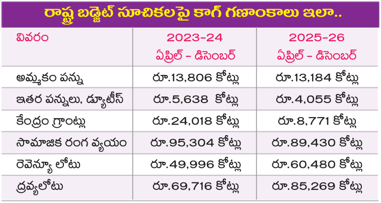 2023–24 ఆర్థిక ఏడాది డిసెంబర్ వరకు పోల్చితే.. ఈ ఆర్థిక ఏడాది డిసెంబర్ నాటికి అమ్మకం పన్ను రాబడి ఏకంగా రూ.6,22 కోట్లు తగ్గిపోయింది. దేశవ్యాప్తంగా 23 రాష్ట్రాల్లో పన్ను ఆదాయాల వృద్ధి విషయంలో ఆంధ్రప్రదేశ్ 22వ స్థానంలో నిలిచింది. చిట్ట చివరి నుంచి ఏపీ రెండో స్థానంలో ఉంది. అమ్మకం పన్ను రాబడి క్షీణించడం అంటే ప్రజల కొనుగోలు శక్తి పడిపోవడమేనని స్పష్టం అవుతోంది. ఇక 2023–24 డిసెంబర్ వరకు పోల్చి చూస్తే సామాజిక రంగ వ్యయం 2025–26 డిసెంబర్ నాటికి రూ.5,874 కోట్లు తగ్గిపోయింది.