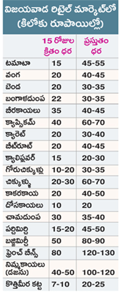 కూరగాయల ధరలు ఒక్కసారిగా పెరిగాయి. 15 రోజుల క్రితం వరకు నిలకడగా ఉన్న ధరలు ప్రస్తుతం అమాంతం పెరిగిపోయాయి. టమాటా మూడు రెట్లు పెరిగింది. ఇతర కూరగాయల ధరలు కూడా రూ.10–30 వరకు పెరిగాయి. డీజిల్ కొరత కారణంగా వాహనాలు రావడం లేదు. సరుకు లేకపోవడం వల్ల ధరలు పెంచాల్సి వస్తోందని రిటైల్ వ్యాపారులు చెబుతున్నారు.