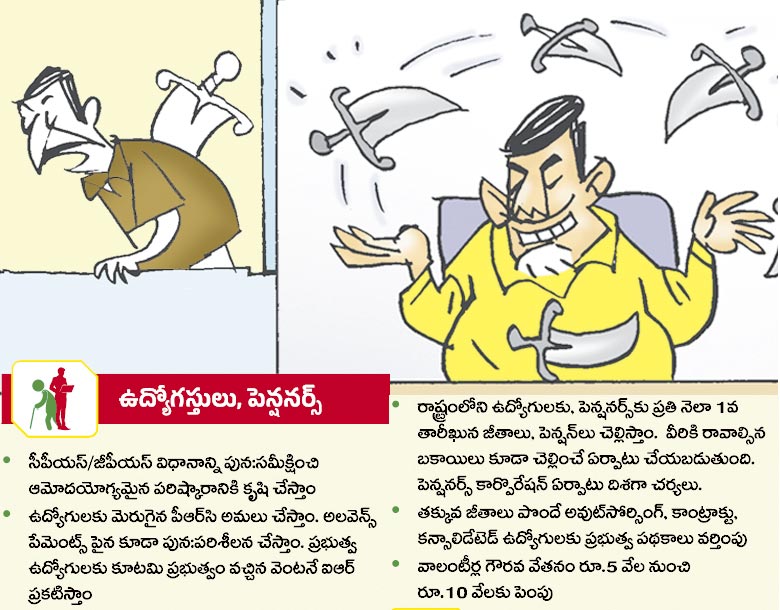 కూటమి ఎన్నికల మేనిఫెస్టోలో సీపీఎస్, జీపీఎస్ విధానాలను సమీక్షించి జీపీఎస్ కంటే మెరుగైన అందరికీ ఆమోదయోగ్యమైన విధానాన్ని తెస్తామని ప్రకటించారు. కానీ ఇప్పటివరకూ ఆ ఊసే ఎత్తలేదు. కాంట్రాక్టు ఉద్యోగులను క్రమబదీ్ధకరిస్తూ వైఎస్ జగన్ ప్రభుత్వం చట్టం చేయగా చంద్రబాబు దాన్ని తుంగలో తొక్కారు. మరోవైపు అవుట్సోర్సింగ్ ఉద్యోగాలపై మళ్లీ పాత విధానం తెచ్చేందుకు ప్రయత్నిస్తూ ఆప్కాస్ను ఎత్తివేయడానికి సిద్ధమవుతుండడంతో వారు లబోదిబో