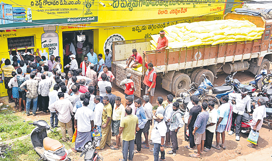ఏలూరు జిల్లా కో–ఆపరేటివ్ సొసైటీ వద్ద యూరియా కోసం బారులు తీరిన రైతులు (ఫైల్)