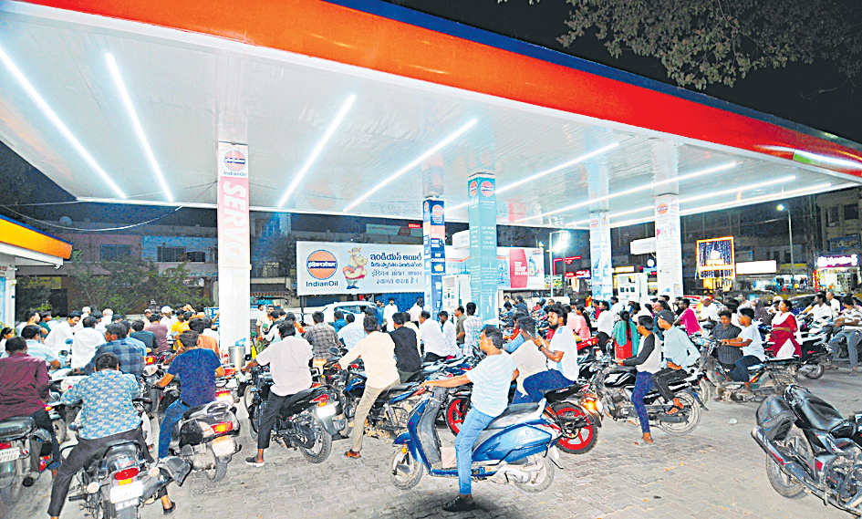 గుంటూరు లాడ్జి సెంటర్లో ఇండియన్ ఆయిల్ పెట్రోల్ బంక్ వద్ద బారులుతీరిన వాహనాలు