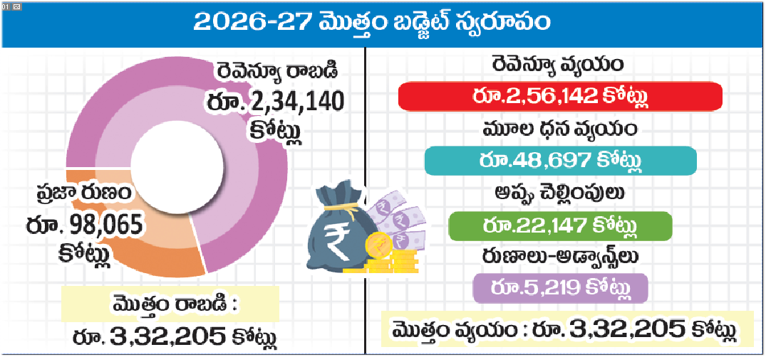 రెండో ఏడాది నుంచి అనేక ఆంక్షలతో అరకొరగా అమలు చేస్తున్నారు. ఇక ఉద్యోగుల బకాయిలు దాదాపు రూ.40 వేల కోట్లు ఉండగా పెండింగ్లో ఉన్న 4 డీఏలు ఎప్పుడు అందుతాయో తెలియని దుస్థితి నెలకొంది. ఇలా అన్ని వర్గాలను మోసం చేస్తూ రూ.3.32 లక్షల కోట్లతో 2026–27 వార్షిక బడ్జెట్ను టీడీపీ కూటమి సర్కారు బడ్జెట్ను శనివారం అసెంబ్లీకి సమర్పించింది. సంక్షేమం, అభివృద్ధి, సంపద సృష్టి అనేది బడ్జెట్లో ఎక్కడా లేకపోగా ప్రభుత్వ గ్యారెంటీ రుణాలను దాచి పెట్టింది. భారీ అప్పులు, పన్నులు, పన్నేతర వాతలు మాత్రం బడ్జెట్లో ప్రస్ఫుటంగా కనిపించాయి. పది సూత్రాల సూక్తులు మినహా కార్యాచరణ బడ్జెట్లో కానరాలేదు.