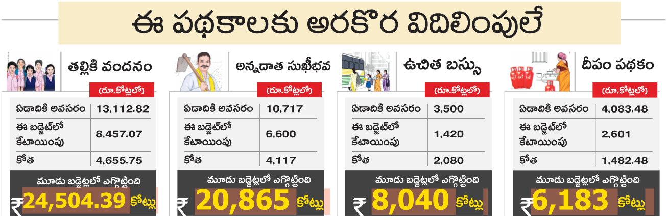 మొదటి ఏడాది పూర్తిగా ఎగ్గొట్టి రెండో ఏడాది కోతలతో సరిపుచ్చారు. అన్నదాతా సుఖీభవ కింద పాత బకాయిలతో కలిపి రూ.27,455 కోట్లు ఇవ్వాల్సి ఉంటే బడ్జెట్లో చేసిన కేటాయింపులు రూ.6,600 కోట్లు మాత్రమే. దీపం పథకం అమలుకు ఏటా రూ.4,200 కోట్లు అవసరం కాగా బడ్జెట్లో ప్రతిపాదించింది కేవలం రూ.2,601 కోట్లే! ‘దీపం’ పథకం కింద బకాయిలతో కలిపి రూ.6,183 కోట్లు ఎగనామం పెట్టారు. మహిళలకు ఉచిత బస్సు హామీని తొలి ఏడాది నెరవేర్చకుండా రూ.3,200 కోట్లు ఎగ్గొట్టారు.
