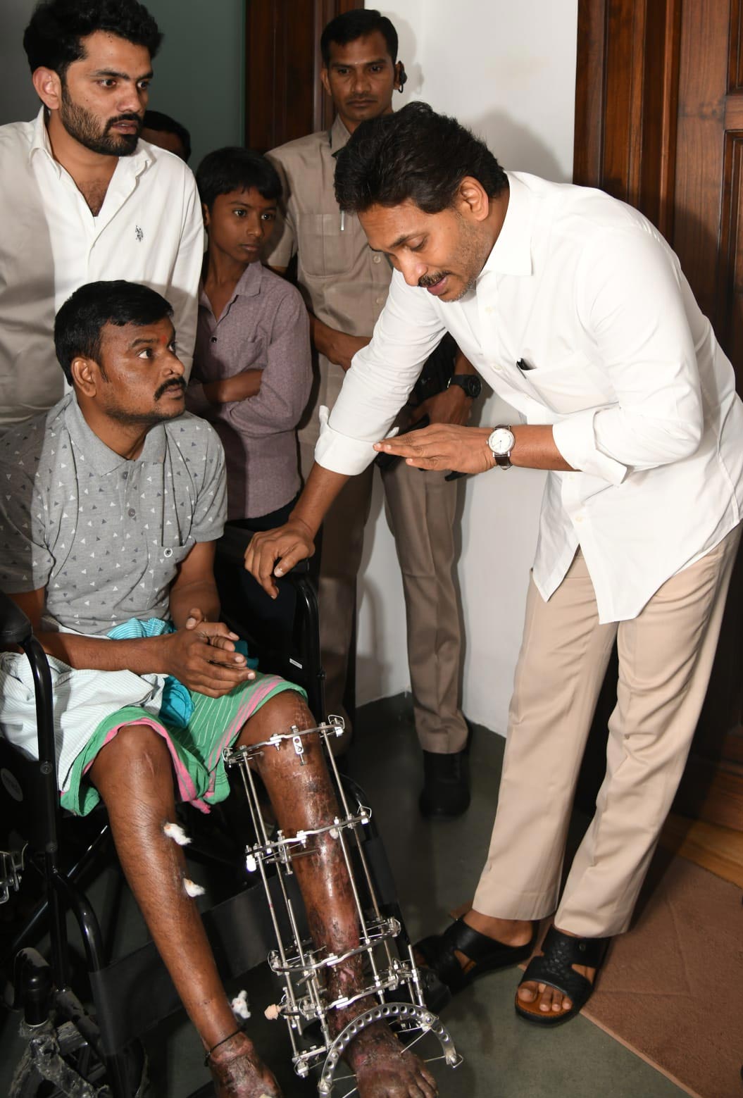 పల్నాడు జిల్లా గురజాల నియోజకవర్గం తేలుకుట్ల గ్రామానికి చెందిన వైఎస్సార్సీపీ కార్యకర్త చల్లా నాగరాజు.. 2024 అక్టోబర్లో టీడీపీ గూండాల చేతిలో తీవ్రంగా గాయపడ్డాడు. అసెంబ్లీ ఎన్నికల్లో వైఎస్సార్సీపీ పోలింగ్ ఏజెంట్గా ఉన్నందుకు రాడ్లతో దాడిచేసి, నాగరాజు రెండు కాళ్ళు విరగ్గొట్టి తీవ్రంగా గాయపరిచారు. తనపై టీడీపీ గూండాలు ఏ విధంగా దాడిచేశారనేది, తన కుటుంబాన్ని ఎలా ఇబ్బందులు పెడుతున్నారనేది వైయస్ జగన్కు వివరించాడు. రెండు కాళ్ళు విరిగిపోవడంతో వీల్ ఛైర్కే పరిమితమై కుటుంబ పోషణ తీవ్ర ఇబ్బందిగా ఉందని జగన్ దృష్టికి తీసుకెళ్లాడు. నాగరాజు పరిస్థితికి చలించిపోయిన వైఎస్ జగన్.. పార్టీ తరపున ఆదుకుంటామని భరోసా ఇచ్చారు.