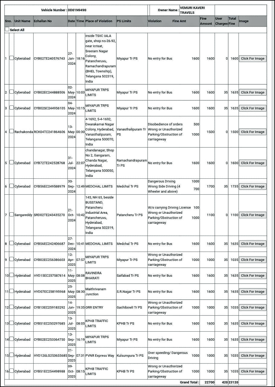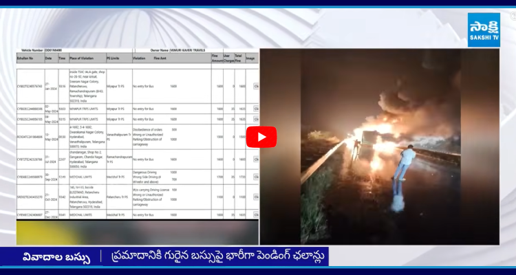 సాక్షి, కర్నూలు: ఘోర ప్రమాదానికి గురైన బస్సుపై భారీగా ట్రాఫిక్ జరిమానాలు పెండింగ్ ఉన్నాయని రవాణా శాఖ వెల్లడించింది. 2024 నుంచి చలానాలు పెండింగ్లో ఉన్నట్లు అధికారులు గుర్తించారు. జనవరి(2024) నుంచి అక్టోబర్ (2025) వరకు 16 సార్లు ట్రాఫిక్ నిబంధనలను ఉల్లంఘించినట్లు తేలింది. రూ.23120 చలానా పెండింగ్లో ఉంది. హైస్పీడ్, డేంజర్ డ్రైవింగ్ కారణంగా రెండు చలానాలు బస్సుపై ఉన్నాయి. తొమ్మిది సార్లు నో ఎంట్రీ జోన్లోకి ప్రవేశించడంతో జరిమానాలు పడ్డాయి. బస్సు ఫిట్నెస్, అనుమతులు.. ఒడిశా పరిధిలోకి వస్తాయని అధికారులు పేర్కొన్నారు.