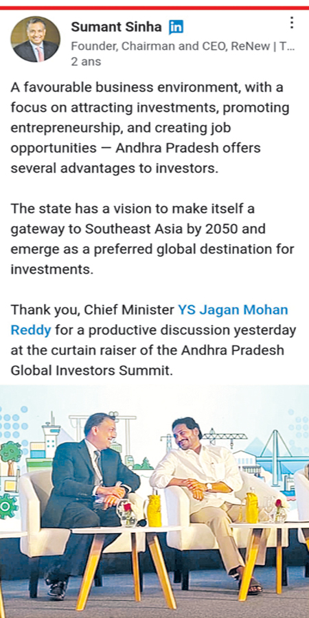 వైఎస్సార్సీపీ హయాంలో జరిగిన ఒప్పందంపై నాటి సీఎం వైఎస్ జగన్తో భేటీ అనంతరం రెన్యూ పవర్ చైర్మన్, సీఈవో సుమంత్ సిన్హా పోస్టు