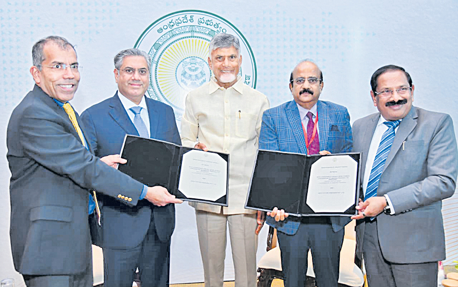 హీరో ఫ్యూచర్ ఎనర్జీస్ సంస్థ సీఎండీ రాహుల్ ముంజాల్తో తాజాగా మళ్లీ విశాఖపట్నంలో ఒప్పంద పత్రాలు మార్చుకుంటున్న సీఎం చంద్రబాబు