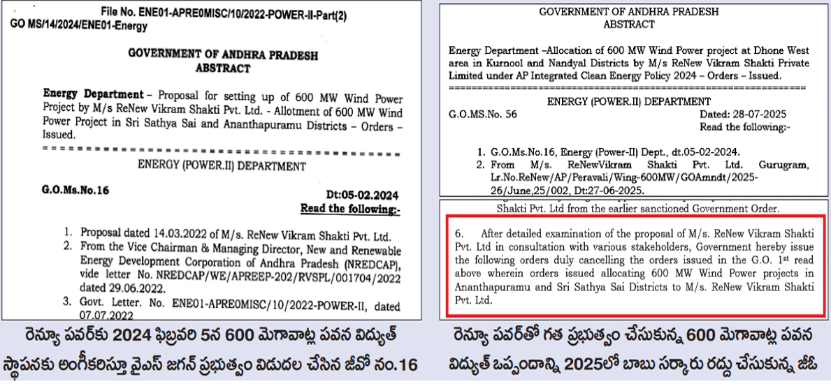 రెన్యూ పవర్కు 2023 జూన్ 20న 300 మెగావాట్ల పవన విద్యుత్ ప్రాజెక్ట్ స్థాపనకు అనుమతిస్తూ వైఎస్సార్సీపీ ప్రభుత్వం జారీ చేసిన జీవో 15