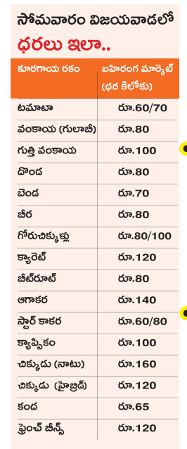 మార్కెట్లో కిలో వంకాయలు రూ.80 వరకు పలుకుతున్నాయి. బెండకాయలు, దొండకాయల ధరలు ఇందుకు భిన్నంగా ఏం లేవు. బీరకాయలు కిలో రూ.40 నుంచి రూ.80 వరకూ పలుకుతున్నాయి. రైతుబజారుల్లో ధరలు ఇలా ఉంటే బహిరంగ మార్కెట్లో మరీ దారుణం. – తంగుడు నాగమణి, మండలవీధి, గృహిణి, శ్రీకాకుళం నగరం.