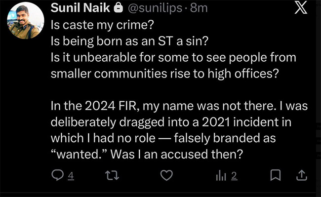 సాక్షి, విజయవాడ: తాను ఎస్టీగా పుట్టడమే నేరమా? అంటూ ఐపీఎస్ అధికారి సునీల్ నాయక్ సంచలన పోస్ట్ చేశారు. ‘‘ఉన్నత ఉద్యోగాల్లో చిన్నకులాల వారు ఉంటే తట్టుకోలేరా?. రఘురామ కేసులో ఉద్దేశపూర్వకంగా నన్ను ఇరికించారు. 2021లో జరిగిన ఘటన ఇది. 2024లో ఎఫ్ఐఆర్లో నా పేరు లేదు. నా పాత్ర లేకున్నా నన్ను నిందితుడిగా చేర్చారు’’ అంటూ సునీల్ నాయక్ ట్వీట్ చేశారు. రఘురామ కాల్ డేటా తీస్తే ఎంతమందిని బెదిరించారో తెలుస్తుందని.. సరైనా సమయంలో ఆధారాలు బయటపడతానంటూ సునీల్ నాయక్ ఎక్స్ వేదికగా పోస్ట్ చేశారు.