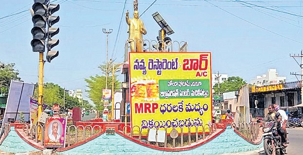 మచిలీపట్నంటౌన్: మద్యం మాఫియా అడ్డగోలుగా వ్యవహరిస్తోంది. నిబంధనలకు విరుద్ధంగా హోర్డింగులతో ప్రచారం హోరెత్తిస్తోంది. జిల్లా కేంద్రంలో మహనీయుల విగ్రహాలకు అడ్డుగా ఫ్లెక్సీలు కడుతున్నా అధికారులు చోద్యం చూస్తుండటంపై సర్వత్రా విస్మయం వ్యక్తమవుతోంది. అధిక ధరలకు తోడు సమయపాలన లేకుండా మద్యం విక్రయాలు జరుపుతూ మమ్మల్ని ఎవడ్రా ఆపేది అంటూ వ్యాపారం సాగిస్తున్నారు మచిలీపట్నంలోని మద్యం వ్యాపారులు.