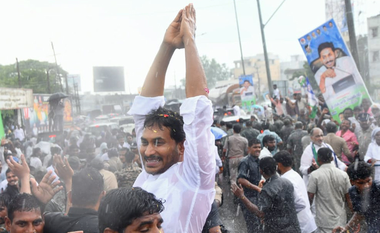 - భారీ వర్షంలోనూ తగ్గేది లేదు అంటున్న జగన్.. అభిమానులు కూడా వర్షాన్ని లెక్కచేయకుండా జగన్కు సంఘీభావం