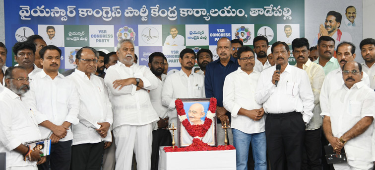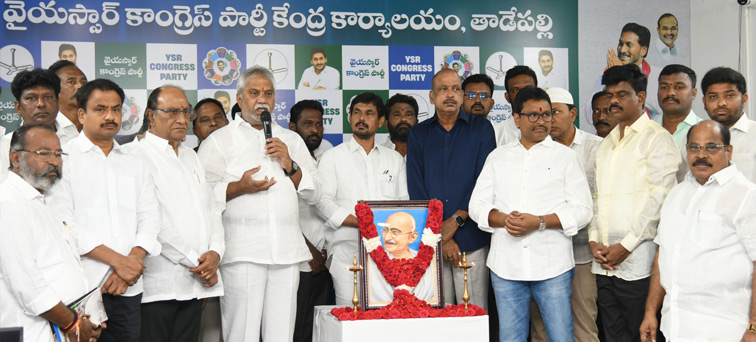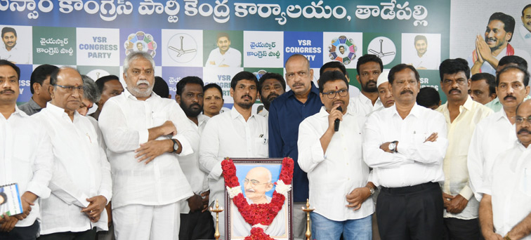 సాక్షి, తాడేపల్లి: సత్యమేవ జయతే అని మహాత్మా గాంధీజీ చెప్పినట్టు తిరుమల లడ్డూ విషయంలోనూ నిజమైందని.. సీబీఐ సిట్ ఛార్జిషీట్ ద్వారా కూటమి నాయకులు చేసిన కుట్రలు, చెప్పిన అబద్ధాలు ప్రజలకు తెలిసిపోయాయని వైఎస్సార్సీపీ నాయకులు స్పష్టం చేశారు. తాడేపల్లిలోని ఆ పార్టీ కేంద్ర కార్యాలయంలో జరిగిన మహాత్మా గాంధీజీ వర్ధంతి కార్యక్రమంలో పార్టీ నాయకులు పాల్గొన్ని ఆయన చిత్రపటానికి పూలమాలలు వేసి నివాళులు అర్పించారు.