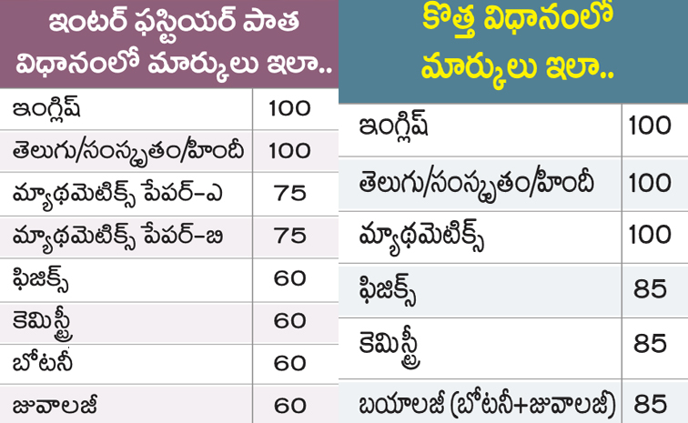 రెండో ఏడాదిలో మ్యాథ్స్ మినహా మిగిలిన ఫిజిక్స్, కెమిస్ట్రీ, బోటనీ, జువాలజీలకు సబ్జెక్టుకు 30 మార్కుల చొప్పున ప్రాక్టికల్స్ మార్కులు కేటాయించేవారు. ఈ విద్యా సంవత్సరంలో ఆర్ట్స్ గ్రూపులు మినహా, సైన్స్ సబ్జెక్టులకు ప్రశ్నల సరళి, మార్కుల కేటాయింపులో మార్పులు చేశారు. మొదటి ఏడాది ఎంపీసీలో మొత్తం మార్కులు యథావిధిగా 470 మార్కులే ఉండగా, బైపీసీలో గతంలో 440 మార్కులు ఉండగా, కొత్త విధానంలో 455 మార్కులకు పెరిగాయి.