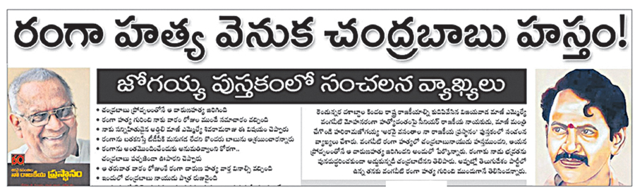 (‘అరవై వసంతాల నా రాజకీయ ప్రస్థానం’ పుస్తకంలో పేర్కొన్నారు) ప్రజా నాయకుడు, విజయవాడ ఎమ్మెల్యేగా ఉన్న వంగవీటి మోహన రంగా హత్య వెనుక ప్రధాన కుట్రదారు చంద్రబాబే. ఆయన ప్రోద్బలంతోనే రంగాను హత్య చేశారు. రంగా జీవించి ఉంటే టీడీపీకి మనుగడ ఉండదని భావించారు. అందుకే రంగా హత్యకు పచ్చ జెండా ఊపారు.’