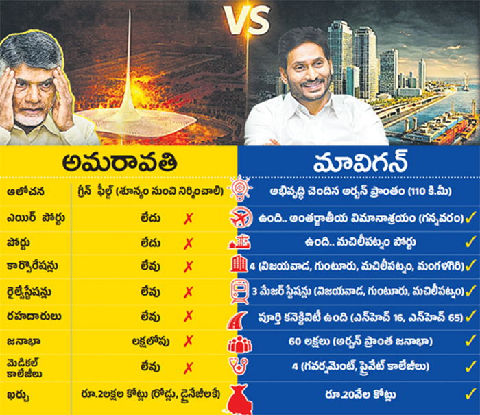 సాక్షి, అమరావతి: మాజీ సీఎం వైఎస్ జగన్ ప్రతిపాదించిన ఆచరణ సాధ్యమైన రాజధాని ‘మావిగన్’ ఓవైపు... ముఖ్యమంత్రి చంద్రబాబు అరచేతిలో వైకుంఠంగా చూపిస్తున్న రాజధాని అమరావతి మరోవైపు..! రాష్ట్ర సర్వతోముఖాభివృద్ధికి గ్రోత్ ఇంజన్గా మావిగన్... రాజధాని ముసుగులో చంద్రబాబు ముఠా అవినీతికి వేదికగా అమరావతి...! రాష్ట్ర రాజధాని అంశం రాష్ట్రంలో రాజకీయ వేడి పుట్టిస్తోంది. ఆకాశంలో మబ్బులు చూసి ముంతలో నీళ్లు పారబోసుకోవడం అవివేకమని ప్రజలు గుర్తిస్తుండటం తాజా పరిణామం. ఆచరణ సాధ్యం కాని అమరావతి కంటే అతివేగంగా సాకారమయ్యే మావిగన్ వైపు ప్రజాభిప్రాయం మొగ్గుతోందన్నది స్పష్టమవుతుండటం ఆసక్తికరంగా మారింది.