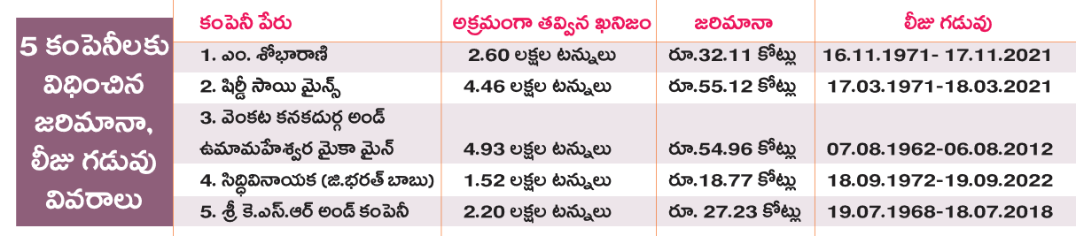 ఈ అక్రమ తవ్వకాలకు సంబంధించి ఆ కంపెనీలకు రూ.188.19 కోట్ల భారీ జరిమానా విధిస్తూ డిమాండ్ నోటీసులు కూడా జారీ చేసింది. అయితే ఆ కంపెనీలు జరిమానా సొమ్మును ప్రభుత్వానికి కట్టకపోగా, మళ్లీ 20 ఏళ్లపాటు లీజులు పొడిగించుకోవడానికి చక్రం తిప్పుతుండడం విస్తుగొలుపుతోంది.
