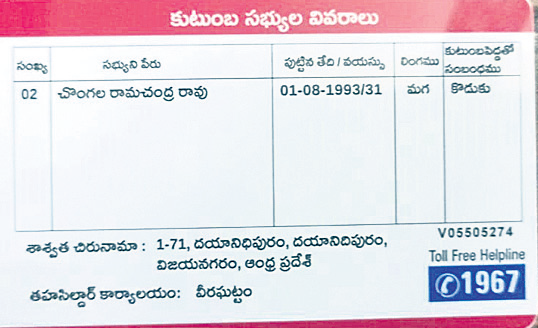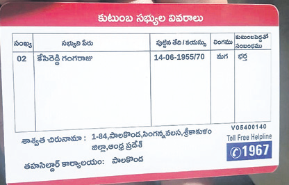 ఈ చిత్రం చూశారా... ఇది వీరఘట్టం మండలం దయానిధిపురం గ్రామానికి చెందిన చొంగల రామచంద్రరావుకు కూటమి ప్రభుత్వం మంజూరు చేసిన స్మార్ట్ రేషన్ కార్డు. పేరు, ఊరుపేరు, మండలం పేరు సరిగా ఉన్నా జిల్లా పేరు పార్వతీపురం మన్యం స్థానంలో విజయనగరం అని ముద్రించారు. వివిధ ధ్రువపత్రాల కోసం స్మార్ట్కార్డు జెరాక్స్ను దరఖాస్తుకు జతచేసిన సమయంలో జిల్లా పేరు తప్పుగా నమోదుకావడంతో అభ్యంతరం తెలుపుతున్నారు. దీనిని సరిచేసేందుకు ఆయన కార్యాలయాల చుట్టూ తిరుగుతున్నారు.