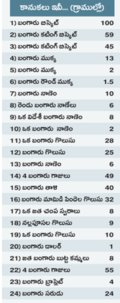 పోలీసుల పంచనామా నివేదికలో పేర్కొన్న ప్రకారం... పరకామణి నుంచి చోరీ చేసినట్టు పెంచలయ్య అంగీకరించిన కానుకలు ఇవీ... (గ్రాముల్లో)