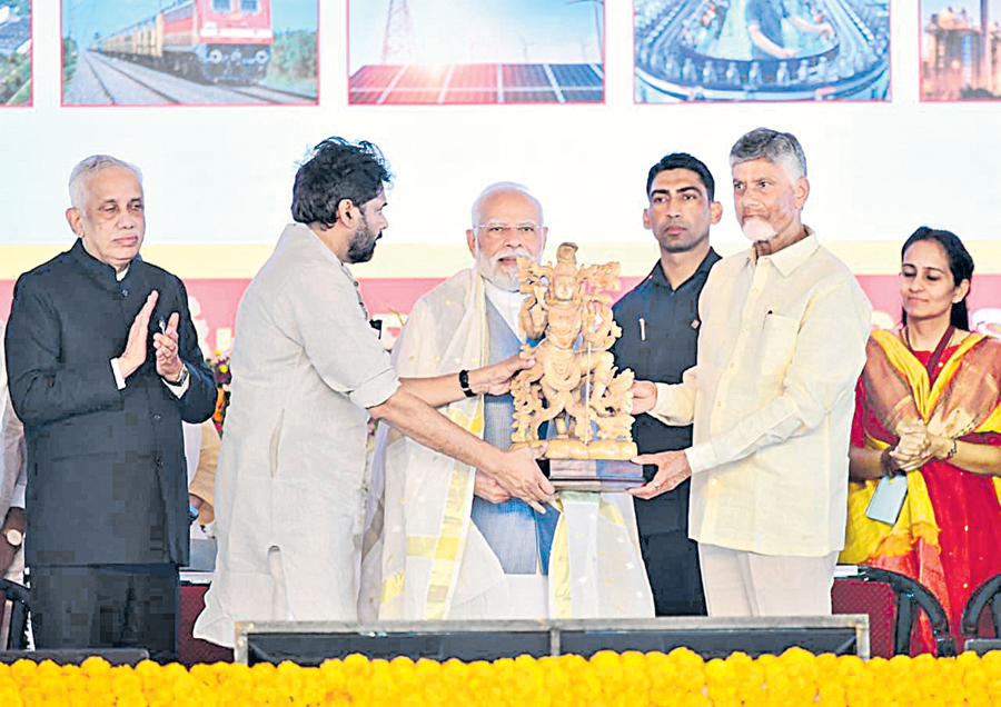 ఈ వేదికపై నుంచి కూడా మరోసారి శివాజీ మహారాజ్కు నివాళులు అర్పిస్తున్నా. మహా శివభక్తులైన అక్క మహాదేవుళ్లను స్మరించుకుంటున్నా. ఉయ్యాలవాడ నరసింహారెడ్డి, హరిసర్వోత్తమరావు లాంటి స్వాతంత్య్ర సమరయోధులకు కూడా నా నివాళులు. ఆంధ్రప్రదేశ్ రాష్ట్రం ఆత్మ గౌరవానికి, గొప్ప సంస్కృతికి, సైన్స్, పరిశోధనలకు నిలయం. ఇక్కడ అభివృద్ధికి అపార అవకాశాలున్నాయి. యువతకు అపారశక్తి ఉంది. ఆంధ్రకు ఇంకా ఏదైనా అవసరం ఉందంటే అది సరైన నాయకత్వం మాత్రమే. ఇప్పుడు శక్తివంతమైన నాయకత్వం ఉంది. దీనికి తోడు ఆం్ర«ధాకు కేంద్ర ప్రభుత్వం పూర్తి సహకారం ఉంది.
