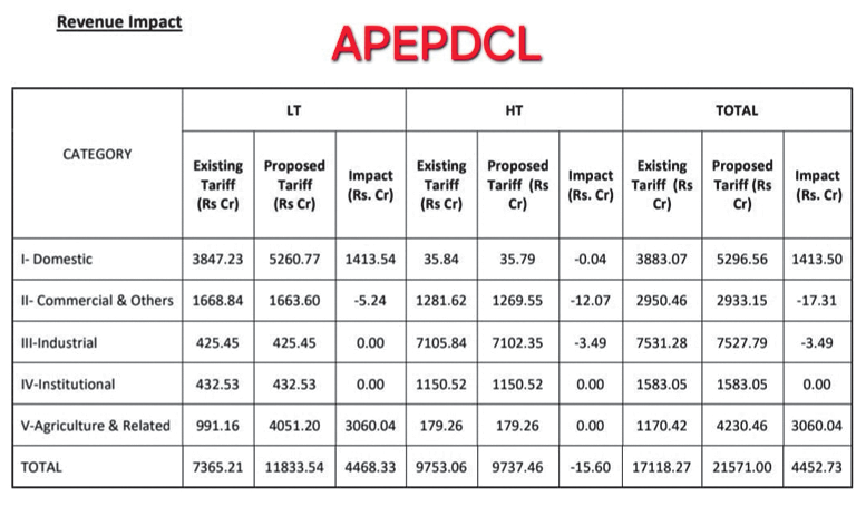 అదే విధంగా తూర్పు డిస్కం వచ్చే ఆర్ధిక సంవత్సరానికి రూ.21,730.59 కోట్లు కావాలని అడిగింది. ఇందులో ప్రస్తుత రేట్ల ప్రకారం రూ.16,550.98 కోట్లు, టారిఫ్ కాకుండా ఇతర ఆదాయం రూ.567.29 కోట్లు పోగా ఇంకా రూ.4,612.32 కోట్లు లోటు ఉంటుందని వివరించింది. అందుకే కొత్త చార్జీల ద్వారా రూ.4,452.73 కోట్లు వసూలు చేసుకుంటామని ఏపీఈపీడీసీఎల్ చెప్పుకొచ్చింది.