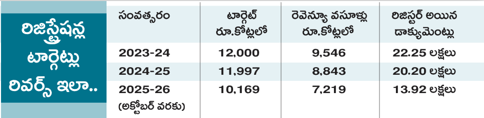 స్థిరాస్తుల రిజిస్ట్రేషన్ల ద్వారా ప్రభుత్వానికి వచ్చే ఆదాయం గతంలో ఎన్నడూ లేనివిధంగా పడిపోవడమే ఇందుకు ఉదాహరణ. 2023–24లో రూ.12 వేల కోట్లుగా ఉన్న రిజి్రస్టేషన్ల టార్గెట్ తాజాగా 2025–26 ఏడాదిలో రూ.10,169 కోట్లకు తగ్గిపోవడం గమనార్హం.