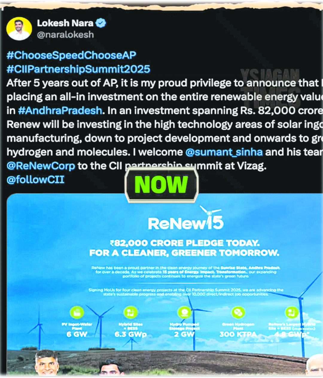 ఇప్పుడు విశాఖలో సీఐఐ సమ్మిట్ వేదికగా మరో క్రెడిట్ చోరీకి శ్రీకారం చుట్టారు. క్రెడిట్ చోరీలో తండ్రితో పోటీ పడుతున్న నారా లోకేశ్ రెన్యూ పవర్ విషయంలో సామాజిక మాధ్యమం ‘ఎక్స్’లో పోస్టు చేసి అడ్డంగా దొరికిపోయారు.