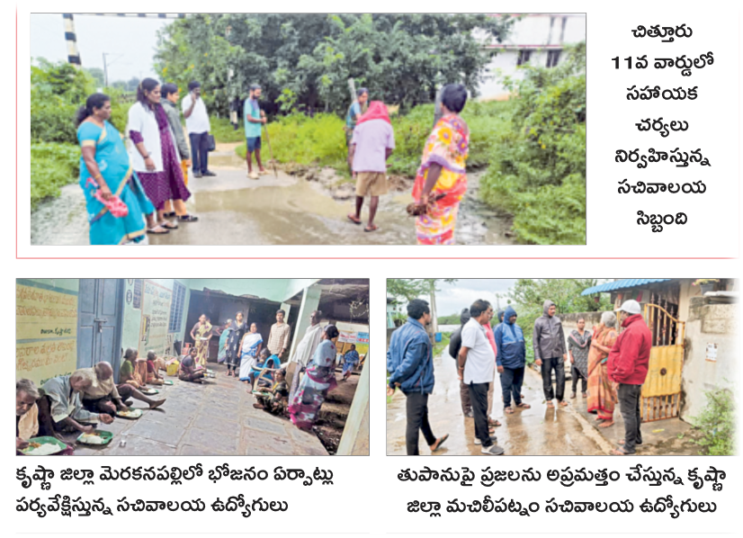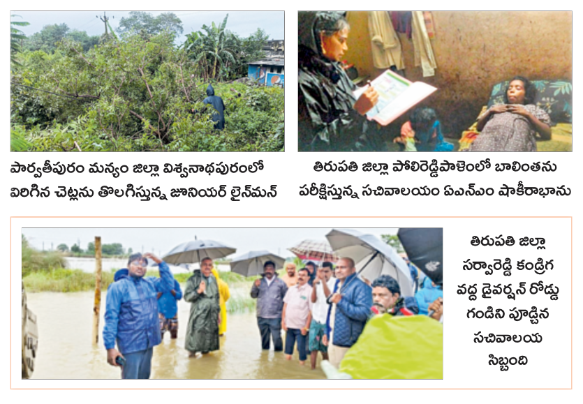 వారే మూడు షిప్టుల్లో రోజంతా సచివాలయంలోనే అందుబాటులో ఉంటూ క్షేత్రస్థాయి తుపాను పరిస్థితుల సమాచారాన్ని ప్రత్యేక యాప్ల ద్వారా ప్రభుత్వానికి చేరవేశారు. క్షేత్రస్థాయిలో తుపాను ప్రభావానికి గురైన గ్రామ వివరాలతో పాటు అక్కడ ఈదురు గాలులు, వర్షాల కారణంగా స్థానికంగా దెబ్బతిన్న ఇళ్లు, రోడ్లు వంటి వివరాలపై ఎంపీడీవోలు, మున్సిపల్ కమిషనర్ల ద్వారా ప్రభుత్వానికి తక్షణ నివేదికలు అందజేశారు.