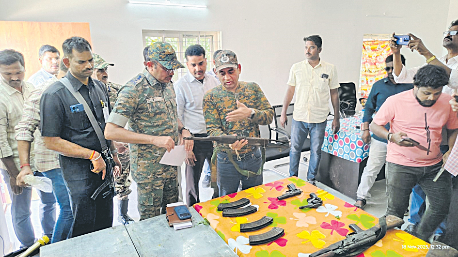 అల్లూరి జిల్లా మారేడుమిల్లిలో స్వాధీనం చేసుకున్న ఆయుధాలను పరిశీలిస్తున్న అడిషనల్ డీజీపీ