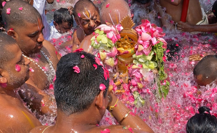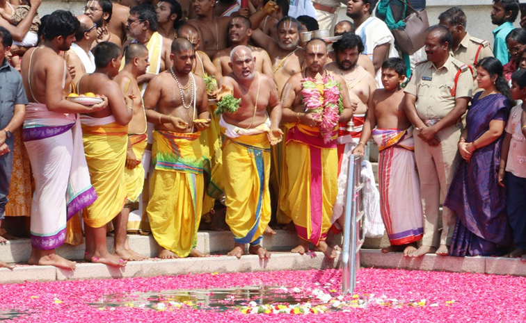 ఆలయంలో ఉదయం 4 గంటలకు సుప్రభాతంతో స్వామివారిని మేల్కొలిపి ఆలయ శుద్ధి, ఆరాధన నిర్వహించారు. ఉదయం 9.30 గంటలకు శ్రీ లక్ష్మణ సమేత సీతారాములవారు తిరుచ్చిలో, సుదర్శన చక్రత్తాళ్వార్ పల్లకిలో ఊరేగింపుగా పుష్కరిణి వద్దకు వేంచేశారు.