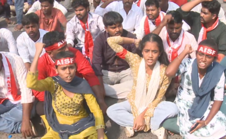 సాక్షి, విజయవాడ: ఎన్నికల హామీలు మరిచిన కూటమి సర్కార్పై ఏఐఎస్ఎఫ్ ఆగ్రహం వ్యక్తం చేసింది. ఇచ్చిన మాట తప్పిన విద్యాశాఖ మంత్రి లోకేష్పై విద్యార్థి సంఘ నేతలు మండిపడ్డారు. లోకేష్తో జరిగిన సమావేశం అసంపూర్తిగా ముగిసిందని.. ఏ అంశం మీదా స్పష్టమైన హామీ రాలేదని విద్యార్థులు అసంతృప్తి వ్యక్తం చేశారు. విద్యారంగంలో సమస్యలు వెంటనే పరిష్కరించాలని డిమాండ్ చేశారు. మంత్రి లోకేష్ ఇంటి ముట్టడికి బయలుదేరిన విద్యార్థి సంఘాలను పోలీసులు అడ్డుకున్నారు. ఈ క్రమంలో ఉద్రిక్తత పరిస్థితి నెలకొంది. విద్యార్థులు, పోలీసులకు మధ్య తోపులాట జరిగింది.