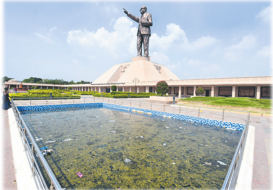 సామాజిక న్యాయ మహా శిల్పం ప్రాంగణంలో చెత్తాచెదారం, నాచుతో నిండి ఉన్న ఫౌంటైన్