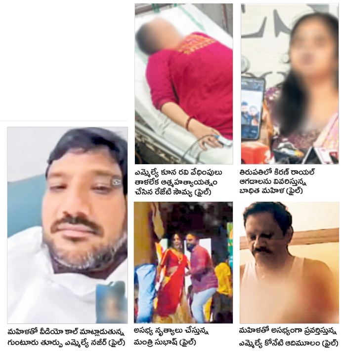 సత్యవేడు ఎమ్మెల్యే కోనేటి ఆదిమూలం, తిరుపతి కూటమి నేత కిరణ్ రాయల్, గుంటూరు తూర్పు ఎమ్మెల్యే మహ్మద్ నజీర్, ఆమదాలవలస ఎమ్మెల్యే కూన రవికుమార్, మంత్రి వాసంశెట్టి సుభాష్, కూటమి మద్దతుదారు జానీ మాస్టర్.. ఇలా ఎంతో మంది దురాగతాలు బట్టబయలు కావడం కలకలం రేపింది. ఇక నియోజకవర్గాల్లో కూటమి పార్టీల ద్వితీయ శ్రేణి నేతల ఆగడాలు, మహిళలపై వేధింపులు తరచూ బయట పడుతూనే ఉన్నాయి.