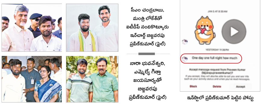 సాక్షి టాస్క్ఫోర్స్: టీడీపీ నేతలు రోజురోజుకూ మరింత బరితెగిస్తున్నారు. ఉమ్మడి కర్నూలు జిల్లాలో ఓ టీడీపీ ఎమ్మెల్యే రాసలీలల వ్యవహారం ఇటీవల చర్చనీయాంశంగా మారిన విషయం తెలిసిందే. దానిని మరువకముందే తాజాగా బిగ్బాస్–8 మహిళా కంటెస్టెంట్ను ఉద్దేశించి ఇన్స్టాగ్రామ్లో ఐటీడీపీ నంద్యాల జిల్లా నందికొట్కూరు నియోజకవర్గ ఇన్చార్జ్ బిజ్జవరపు ప్రవీణ్కుమార్ ఓ అసభ్యకర పోస్టు పెట్టారు. గత ఆదివారం రాత్రి 11.21 గంటల సమయంలో ‘నైట్కి ఎంత తీసుకుంటావు? సుఖంతోపాటు డబ్బులు కూడా ఇస్తా’ అంటూ బిజ్జవరపు ప్రవీణ్కుమార్ ఇన్స్టాగ్రామ్లో పెట్టిన పోస్టు సోషల్ మీడియాలో వైరల్ అవుతోంది.