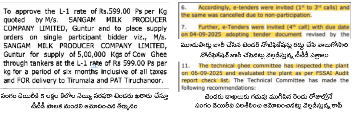 ప్రభుత్వ పెద్దలు ఆదేశించిన ధరకు బిడ్లు దాఖలు చేసి సంగం డెయిరీకి మార్గం సుగమం చేశాయి. ఎంత పక్కాగా కథ నడిపారు అంటే.. బిడ్లు దాఖలు చేసేందుకు గడువు తేదీ 2025, సెప్టెంబరు 4 తో ముగిసిన రెండు రోజుల్లోనే అంటే సెప్టెంబరు 6నే టీటీడీ టెక్నికల్ కమిటీ సభ్యులు సంగం డెయిరీని సందర్శించి సానుకూలంగా నివేదిక సమర్పించారు.